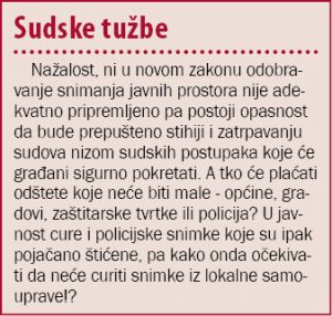 Nažalost, sve to ovim zakonskim propisima nije predviđeno pa možemo reći da situacija odobravanja snimanja javnih prostora nije adekvatno pripremljena i postoji opasnost da bude prepuštena stihiji i zatrpavanju sudova s brojnim sudskim postupcima što će ih zasigurno pokretati građani koji će smatrati da su njihova građanska prava bila ugrožena. Tko će snositi posljedice i plaćati odštete koje zasigurno neće biti male – općine, gradovi, zaštitarske tvrtke ili policija? Vidimo da u javnost cure i policijske snimke, koje su ipak pojačano štićene, pa kako onda možemo očekivati da u javnost neće curiti snimke iz lokalne samouprave.